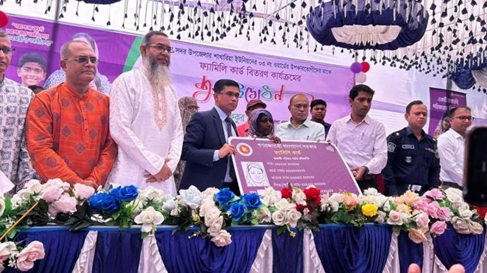 এ সময় তিনি বলেন, সরকারের এই উদ্যোগ প্রান্তিক পর্যায়ের নারীদের জন্য। ইতিমধ্যে সকালেই সবার মোবাইলে টাকা পৌঁছে গেছে। সবকিছু মিলিয়ে এই ফ্যামিলি কার্ড বিতরণ শুভ উদ্বোধন ঘোষণা করছি। এসময় সদর উপজেলা নির্বাহী কর্মকর্তা আব্দুল ওয়াজেদ, কেন্দ্রীয় বিএনপির সদস্য আলী আজগর তালুকদার হেনা, সদর উপজেলা বিএনপির সভাপতি মাফতুন আহমেদ খান রুবেল, জেলা বিএনপির সাংগঠনিক সম্পাদক শহিদ-উন নবী সালাম সহ আরও অনেকে উপস্থিত ছিলেন।
