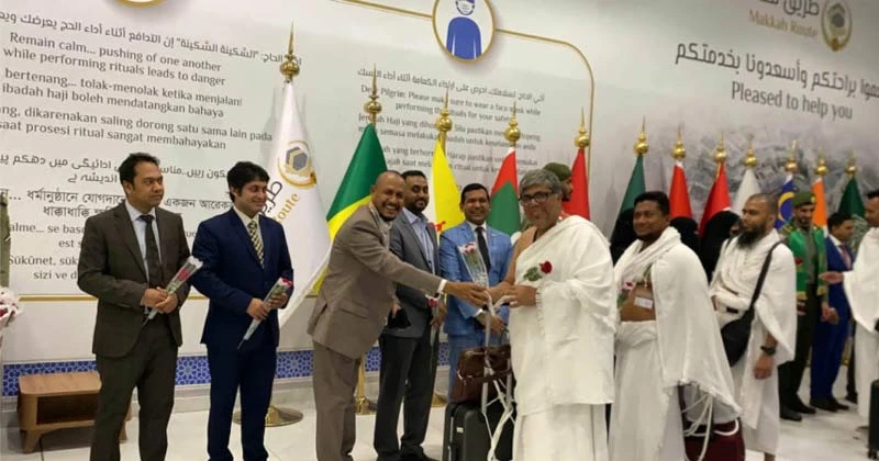 বিমানবন্দরে বাংলাদেশি হজযাত্রীদেরকে অভ্যর্থনা জানান সৌদি আরবে নিযুক্ত বাংলাদেশের রাষ্ট্রদূত মো. দেলওয়ার হোসেন ও কাউন্সিলর (হজ) মো. কামরুল ইসলাম।