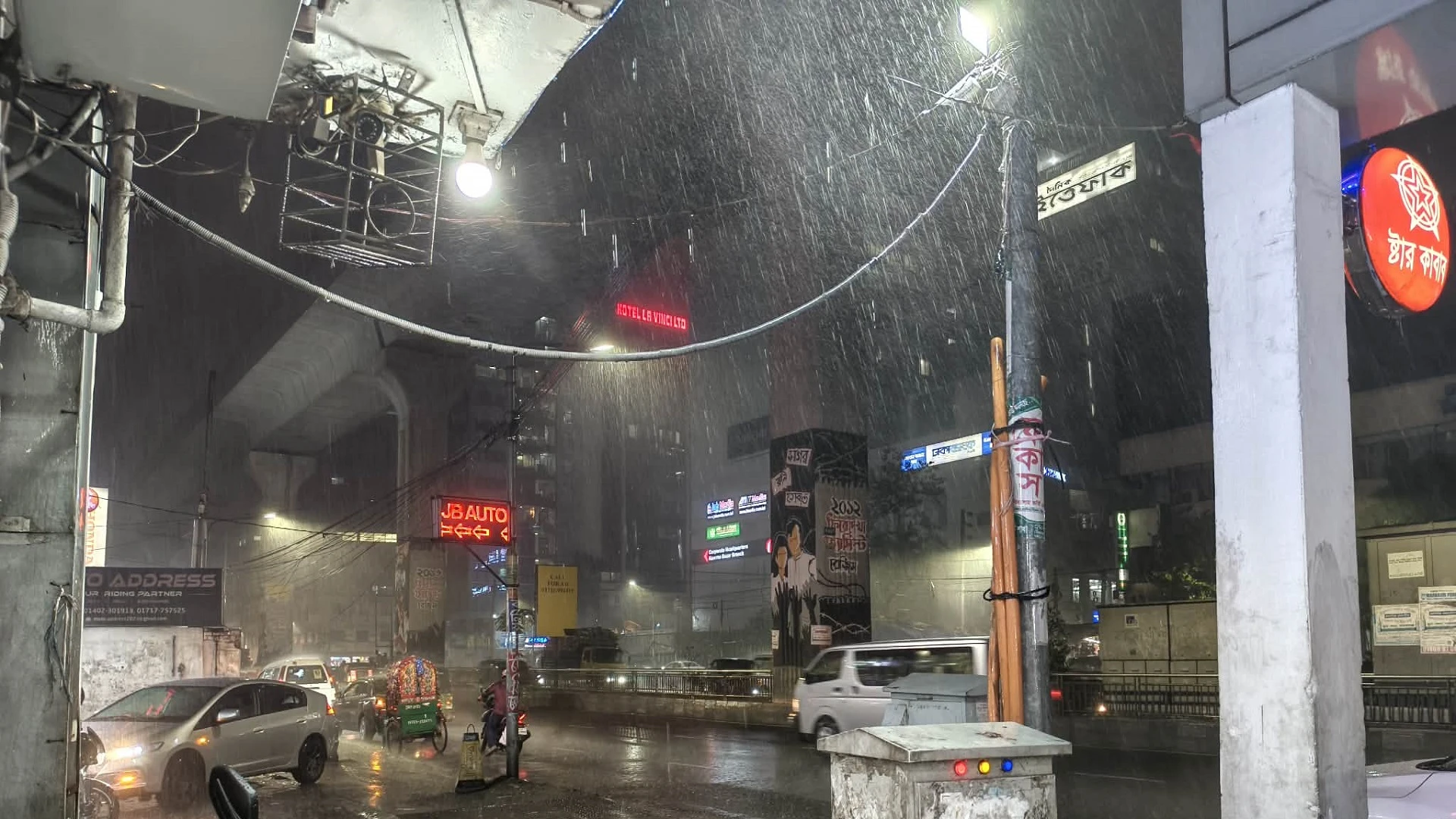 সন্ধ্যার পর হঠাৎ করেই রাজধানীর আকাশ কালো হয়ে ওঠে। ৭টার দিকে হঠাৎ ঝড়ো হাওয়ার সঙ্গে ধুলিঝড় বয়ে যায় বিভিন্ন এলাকায়। এরপর রাত ৮টার দিকে শুরু হয় ঝুম বৃষ্টি। বৃষ্টিতে ভিজেছে বাংলামোটর, শাহবাগ, মগবাজার, কারওয়ান বাজার. ফার্মগেট, তেজগাঁওসহ রাজধানীর বিভিন্ন এলাকা।